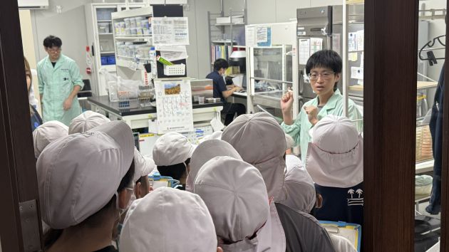 品質検査室では、実際の検体を見せてもらいながら、おいしさと安全を守る検査の大切さを学びました。みんなメモを取る姿が印象的。