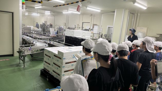 加工場の中では、お母さんスタッフが図や写真を用いて、丁寧に加工から出荷までの流れを説明してくれます。ガラス越しに実際の作業を見たり、整理された作業場に驚いたり、子どもたちは目を輝かせていました。