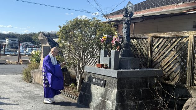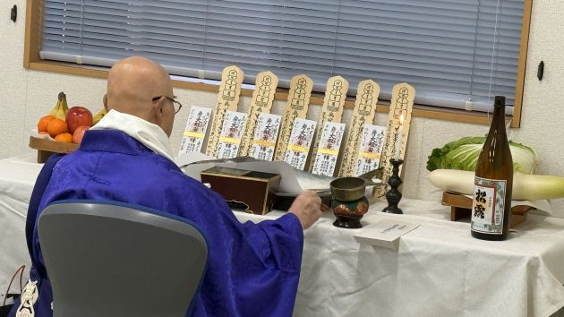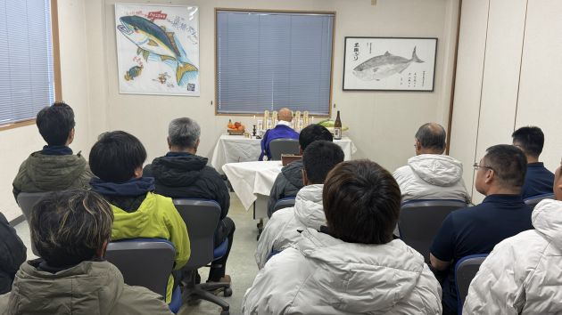 ご住職の読経の中、参列者一同が魚への感謝と、今後も安全に業務が行えるよう祈りを捧げました。